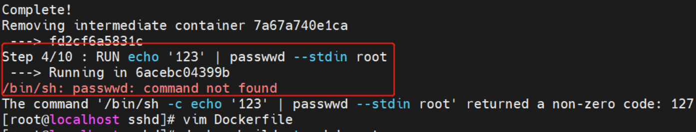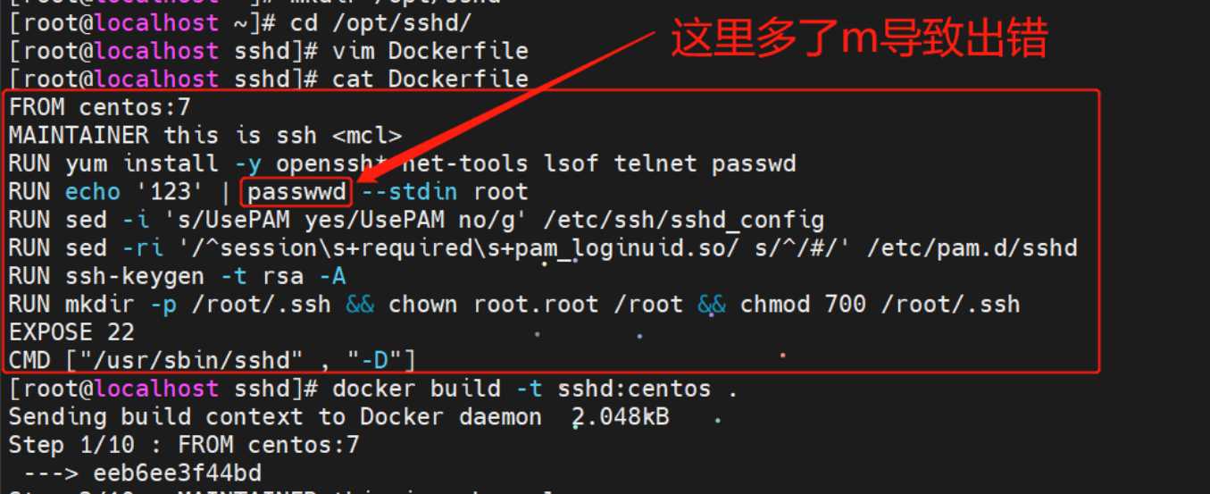mkdir /opt/sshd cd /opt/sshd vim Dockerfile #第一行必须指明基于的基础镜像 FROM centos:7 #作者信息 MAINTAINER this is ssh image <mcl> #镜像的操作指令 RUN yum -y update RUN yum -y install openssh* net-tools lsof telnet passwd RUN echo '123' | passwd --stdin root RUN sed -i 's/UsePAM yes/UsePAM no/g' /etc/ssh/sshd_config #不使用PAM认证 RUN sed -ri '/^session\s+required\s+pam_loginuid.so/s/^/#/' /etc/pam.d/sshd #取消pam限制 RUN ssh-keygen -t rsa -A #生成密钥认证文件 RUN mkdir -p /root/.ssh && chown root.root /root && chmod 700 /root/.ssh EXPOSE 22 CMD ["/usr/sbin/sshd" , "-D"] //生成镜像 docker build -t sshd:centos . //启动容器并修改root密码 docker run -d -P sshd:centos docker ps -a ssh localhost -p 49154