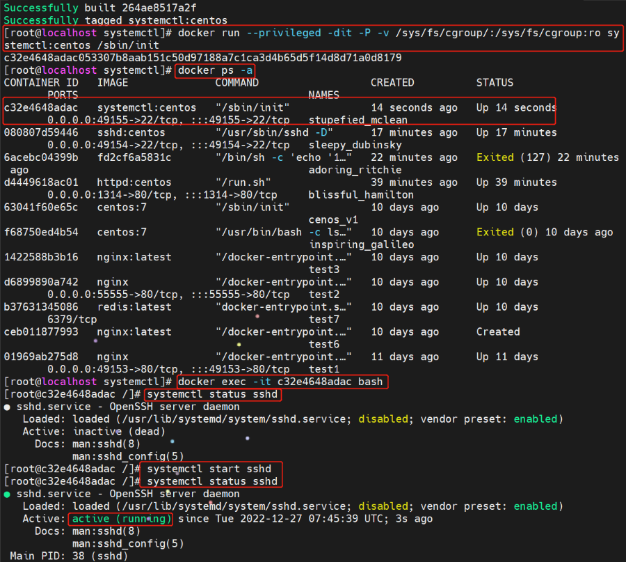 mkdir /opt/systemctl cd /opt/systemctl vim Dockerfile FROM sshd:centos MAINTAINER this is systemctl image <mcl> ENV container docker #除了systemd-tmpfiles-setup.service,删除其它所有文件 RUN (cd /lib/systemd/system/sysinit.target.wants/; for i in *; do [ $i == systemd-tmpfiles-setup.service ] || rm -f $i; done); \ rm -f /lib/systemd/system/multi-user.target.wants/*; \ rm -f /etc/systemd/system/*.wants/*; \ rm -f /lib/systemd/system/local-fs.target.wants/*; \ rm -f /lib/systemd/system/sockets.target.wants/*udev*; \ rm -f /lib/systemd/system/sockets.target.wants/*initctl*; \ rm -f /lib/systemd/system/basic.target.wants/*;\ rm -f /lib/systemd/system/anaconda.target.wants/*; VOLUME [ "/sys/fs/cgroup" ] #CMD ["/usr/sbin/init"] //生成镜像 docker build -t systemd:centos . //启动容器,并挂载宿主机目录挂载到容器中,和进行初始化 docker run --privileged -dit -P -v /sys/fs/cgroup:/sys/fs/cgroup:ro systemctl:centos /sbin/init #--privileged:使container内的root拥有真正的root权限。否则,container内的root只是外部的一个普通用户权限。 docker ps -a //进入容器 docker exec -it c32e4648adac bash systemctl status sshd 方法二: docker run -d -P --privileged sshd:centos /usr/sbin/init &