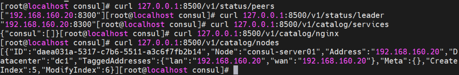 curl 127.0.0.1:8500/v1/status/peers #查看集群server成员 curl 127.0.0.1:8500/v1/status/leader #集群 server-leader curl 127.0.0.1:8500/v1/catalog/services #注册的所有服务 curl 127.0.0.1:8500/v1/catalog/nginx #查看 nginx 服务信息 curl 127.0.0.1:8500/v1/catalog/nodes #集群节点详细信息