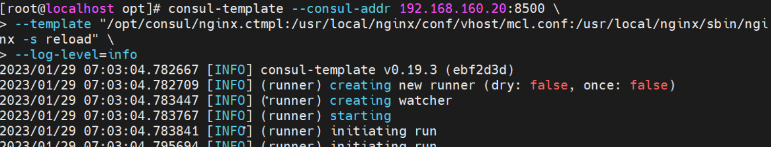 consul-template --consul-addr 192.168.160.20:8500 \ --template "/opt/consul/nginx.ctmpl:/usr/local/nginx/conf/vhost/mcl.conf:/usr/local/nginx/sbin/nginx -s reload" \ --log-level=info