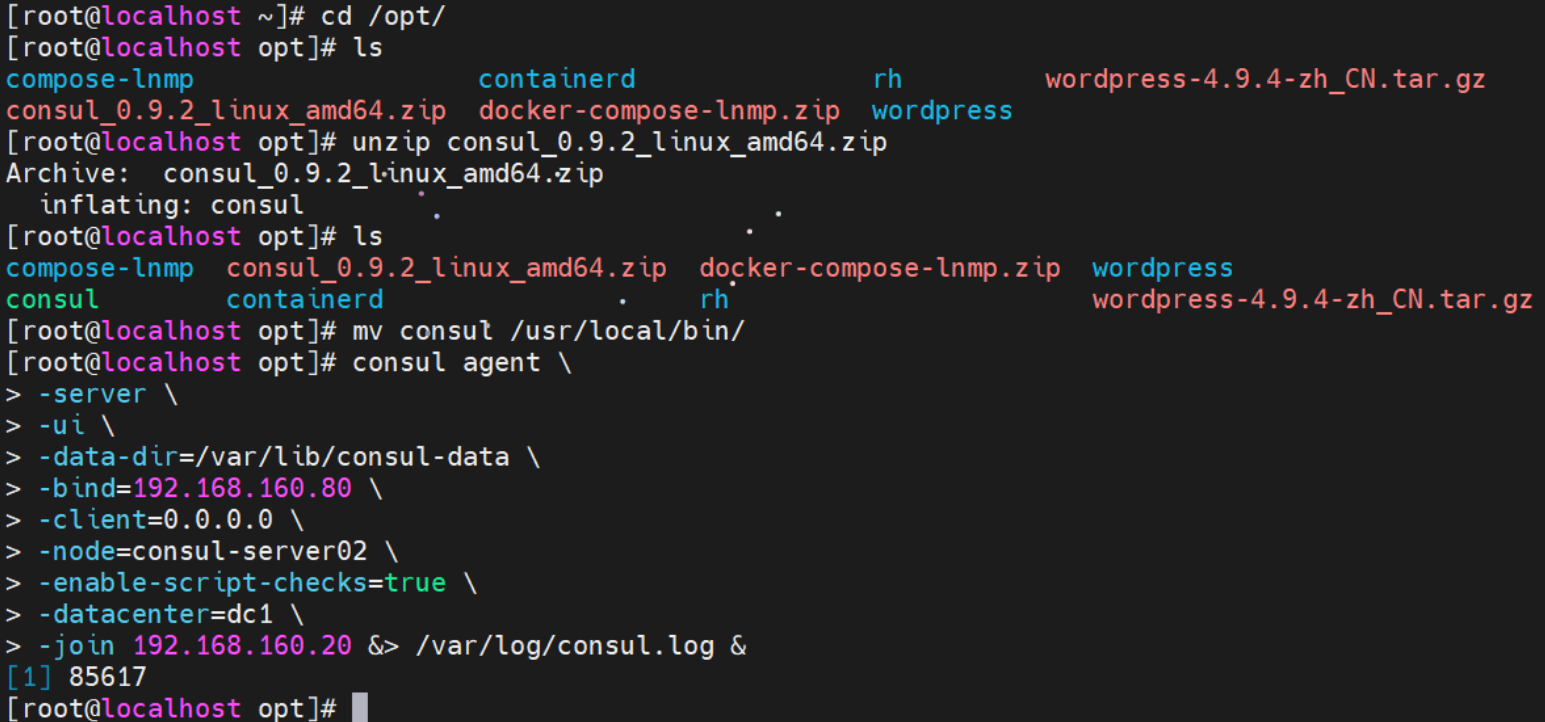 consul agent \ -server \ -ui \ -data-dir=/var/lib/consul-data \ -bind=192.168.160.80 \ -client=0.0.0.0 \ -node=consul-server02 \ -enable-script-checks=true \ -datacenter=dc1 \ -join 192.168.160.20 &> /var/log/consul.log &