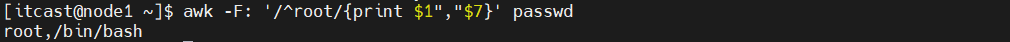 (2)搜索passwd文件以root关键字开头的所有行,并输出该行的第1列和第7列,中间以“,”号分割。