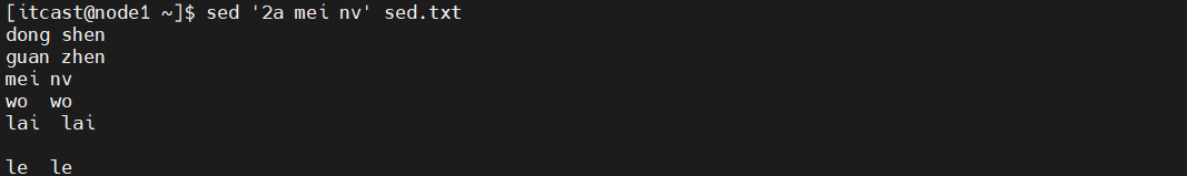 (1)将“mei nv”这个单词插入到sed.txt第二行下,打印。