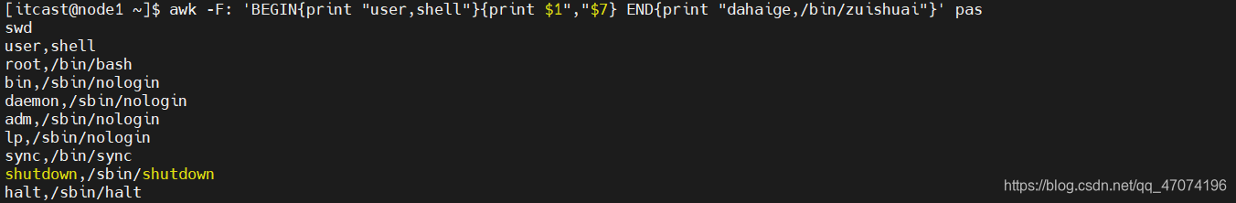 (3)只显示/etc/passwd的第一列和第七列,以逗号分割,且在所有行前面添加列名user,shell在最后一行添加"dahaige,/bin/zuishuai"。