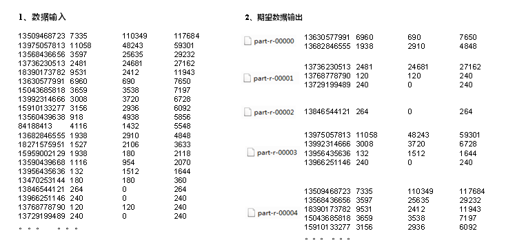 1 13736230513 192.196.100.1 www.atguigu.com 2481 24681 200 2 13846544121 192.196.100.2 264 0 200 3 13956435636 192.196.100.3 132 1512 200 4 13966251146 192.168.100.1 240 0 404 5 18271575951 192.168.100.2 www.atguigu.com 1527 2106 200 6 84188413 192.168.100.3 www.atguigu.com 4116 1432 200 7 13590439668 192.168.100.4 1116 954 200 8 15910133277 192.168.100.5 www.hao123.com 3156 2936 200 9 13729199489 192.168.100.6 240 0 200 10 13630577991 192.168.100.7 www.shouhu.com 6960 690 200 11 15043685818 192.168.100.8 www.baidu.com 3659 3538 200 12 15959002129 192.168.100.9 www.atguigu.com 1938 180 500 13 13560439638 192.168.100.10 918 4938 200 14 13470253144 192.168.100.11 180 180 200 15 13682846555 192.168.100.12 www.qq.com 1938 2910 200 16 13992314666 192.168.100.13 www.gaga.com 3008 3720 200 17 13509468723 192.168.100.14 www.qinghua.com 7335 110349 404 18 18390173782 192.168.100.15 www.sogou.com 9531 2412 200 19 13975057813 192.168.100.16 www.baidu.com 11058 48243 200 20 13768778790 192.168.100.17 120 120 200 21 13568436656 192.168.100.18 www.alibaba.com 2481 24681 200 22 13568436656 192.168.100.19 1116 954 200期望输出数据