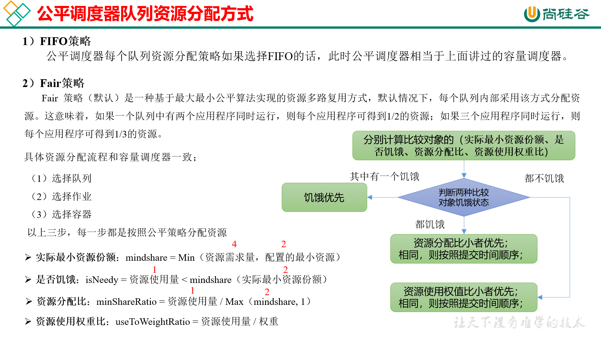 实际最小资源份额:mindshare = Min (资源需求量,配置的最小资源) 是否饥饿:isNeedy = 资源使用量 < mindshare (实际最小资源份额) 资源分配比:minShareRatio = 资源使用量 / Max (mindshare,1) 资源使用权重比:useToWeightRatio = 资源使用量 / 权重