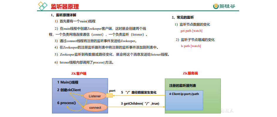 客户端注册监听它关心的目录节点,当目录节点发生变化(数据改变、节点删除、子目 录节点增加删除)时,ZooKeeper 会通知客户端。监听机制保证 ZooKeeper 保存的任何的数 据的任何改变都能快速的响应到监听了该节点的应用程序。