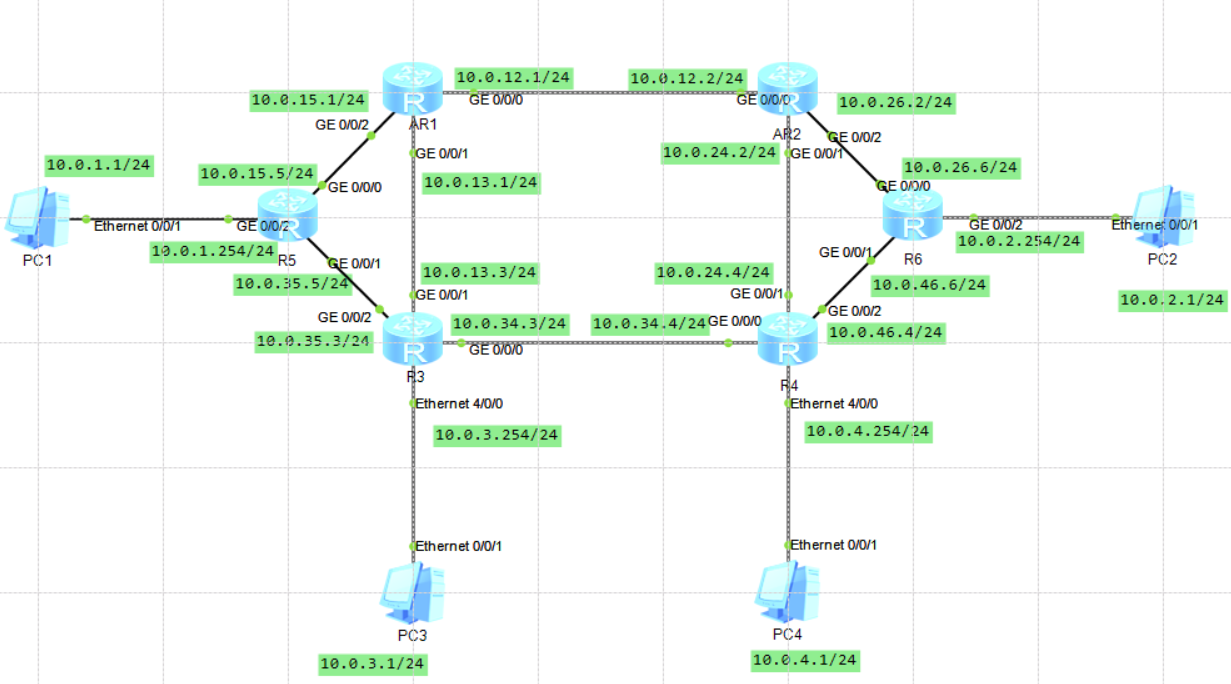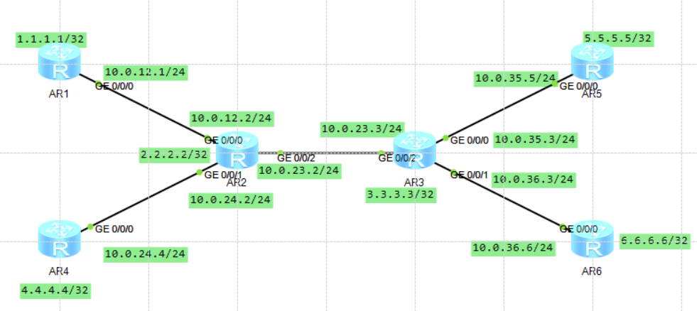 R1、R2、R3、R4为area 0(骨干区),R5为area 1,R6为area 2