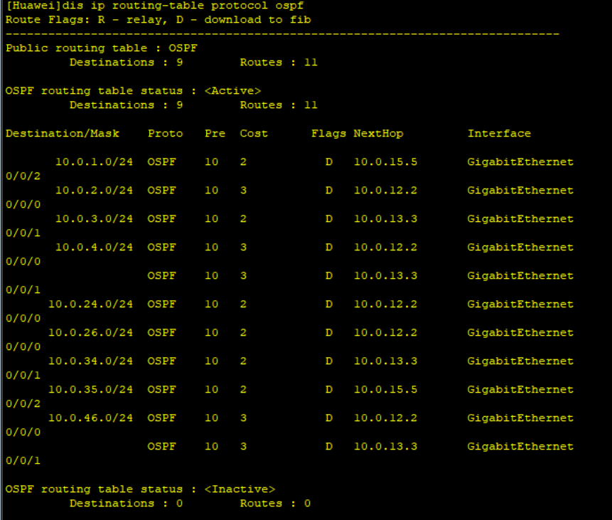 同样在其他网关路由器上进行相应的配置,使得所有部门的终端都不再收到无关的OSPF报文,将其与其他路由器相连的端口抑制后,可以看到邻居全部消失,OSPF路由条目全部消失。