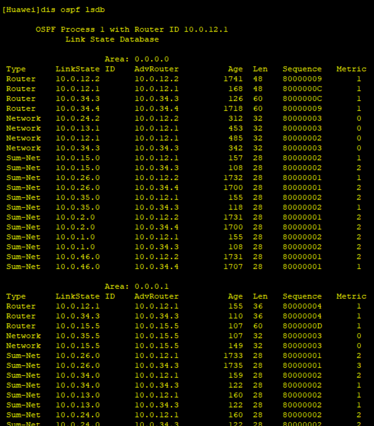 R1ospf链路状态信息库信息,其他区域条目都是通过Sum-net这类LSA获得,而这类LSA是不参与本区域SPF算法运算的。
