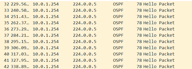 pingPC4--PC1,抓包发现R4不停向这条路线发出OSPF的Hello报文尝试发现邻居,而对于PC而言,该报文是毫无用处的,同时也是不安全的。如果被恶意截取此报文,容易被窃取OSPF网络的重要信息。