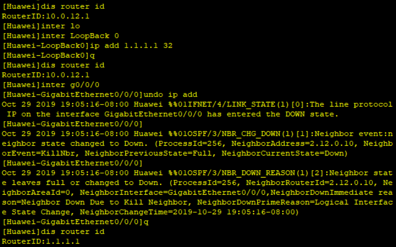 在这之后,配置上环回接口地址,但是其router id 依然显示为物理接口ip,其原因是先入为主,将物理接口undo后,会进行重新选举,按照环回接口优先的原则,将环回接口地址最大的选举为router id。