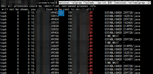 netstat -a|grep ftp|awk '{print $4}'|netstat -altnp|grep :21效果截图如下: