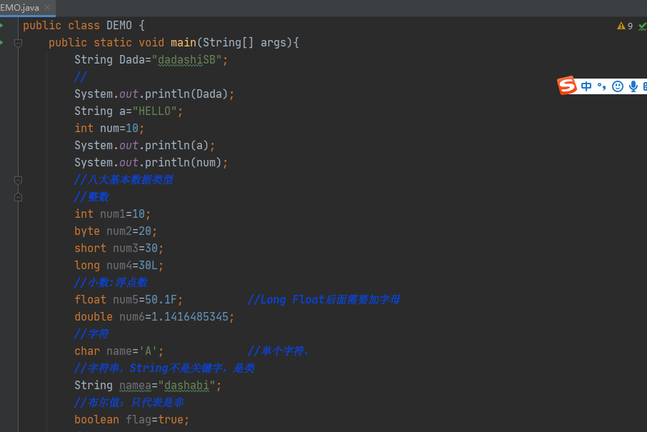 基本类型(primitive type):整数类型,浮点类型,字符类型(char),boolean类型 引用类型(referrence type):类,接口,数组