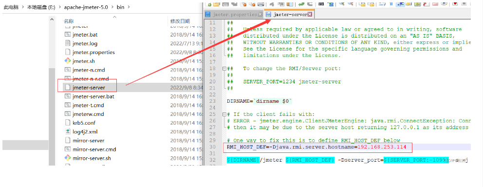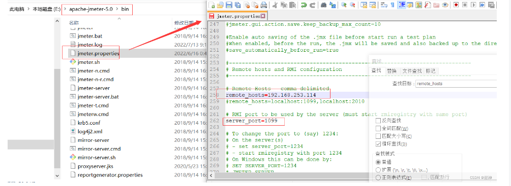 1)进入jmeter安装目录下,打开jmeter.properties文件,放开注释,修改remote_hosts为执行机本机IP,同时修改server_port为1099。