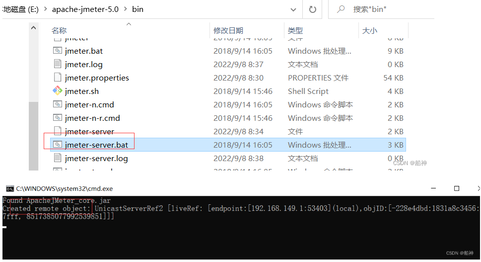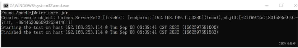 1)从执行机双击jmeter-server.bat启动服务,出现下图效果表示前面的配置都已生效。