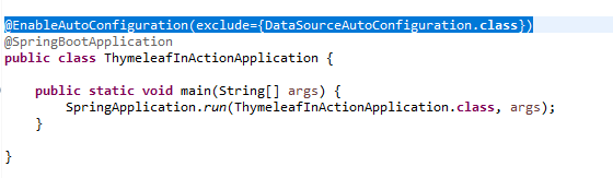 解决办法:在ThymeleafInActionApplication class上方加@EnableAutoConfiguration(exclude={DataSourceAutoConfiguration.class}),如下图所示: