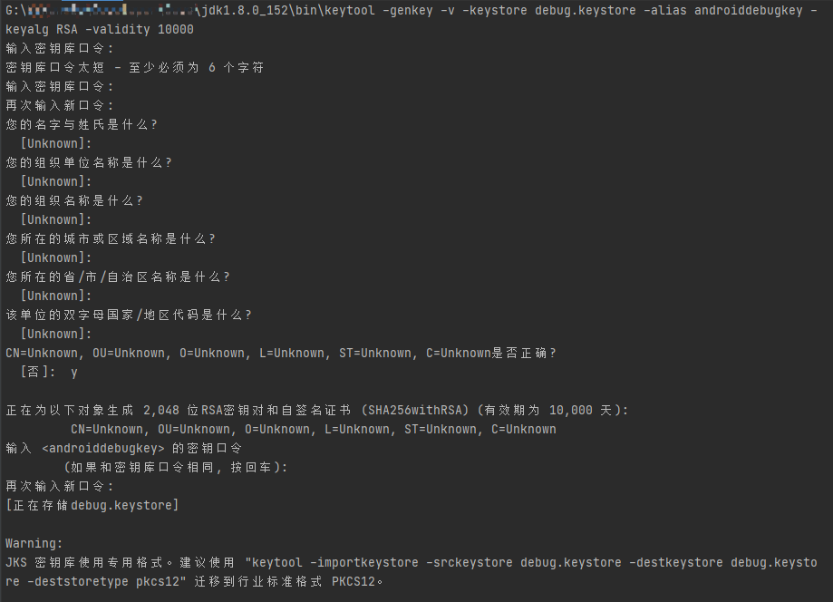 G:\XXX>JDK路径\jdk1.8.0_152\bin\keytool -genkey -v -keystore debug.keystore -alias androiddebugkey -keyalg RSA -validity 10000