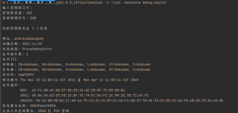 G:\XXX>路径\jdk1.8.0_152\bin\keytool -v -list -keystore debug.keysto