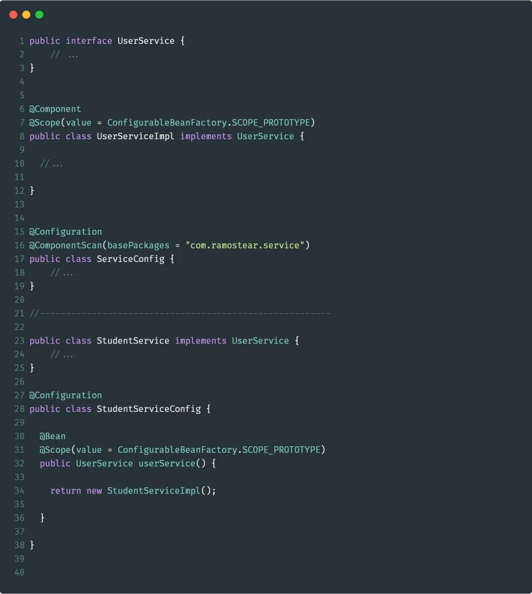 下面将给出两种不同的方式来使用@Scope注解,示例代码如下: