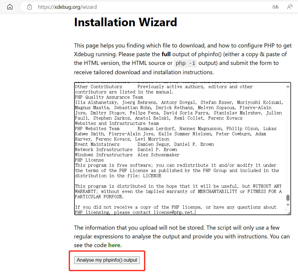 2、ctrl+a 全选复制phpinfo的内容,访问https://xdebug.org/wizard,将复制的内容粘贴到输入框内,点击按钮