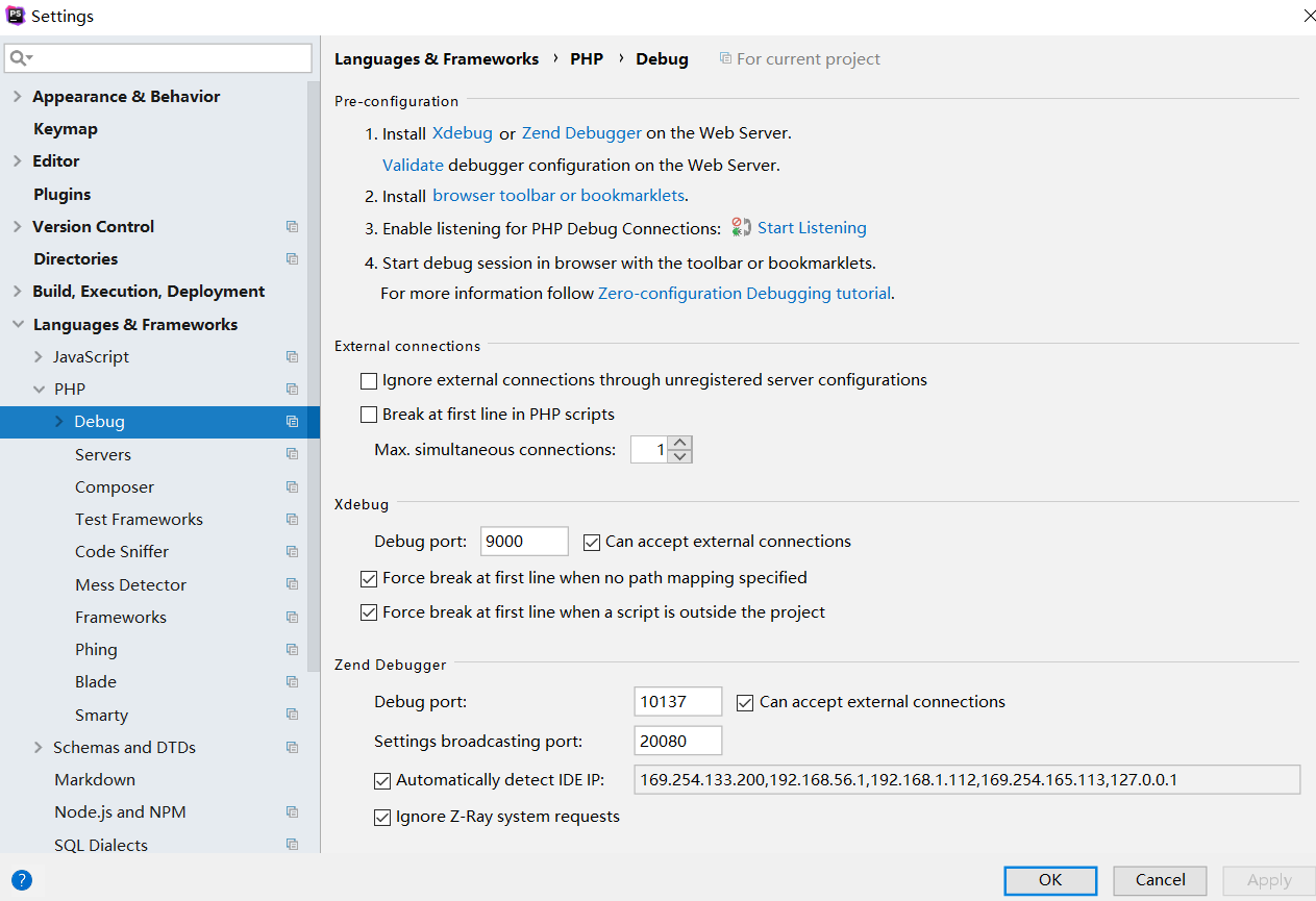 5、点击Debug,配置xdebug端口(注意:php.ini里面的xdebug信息的端口和这里的要一致)