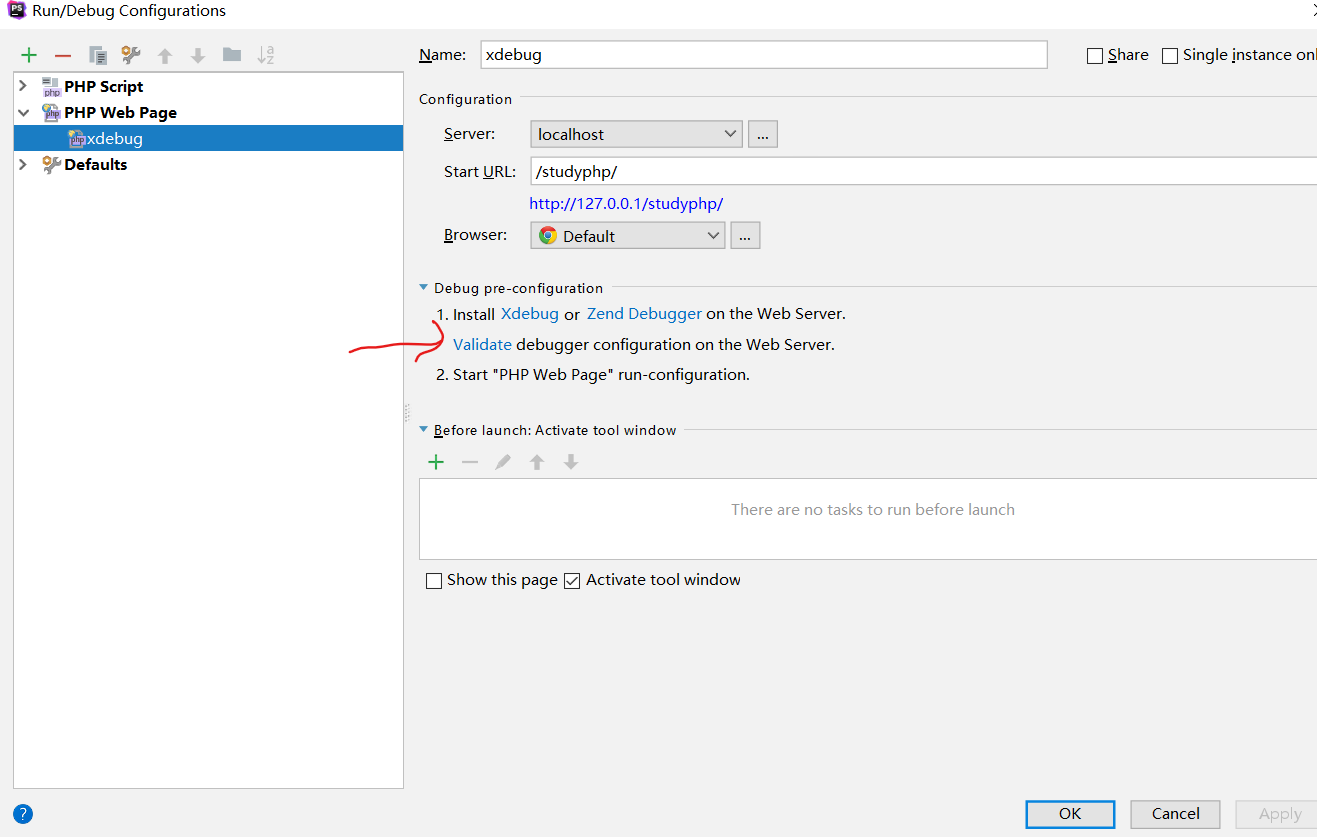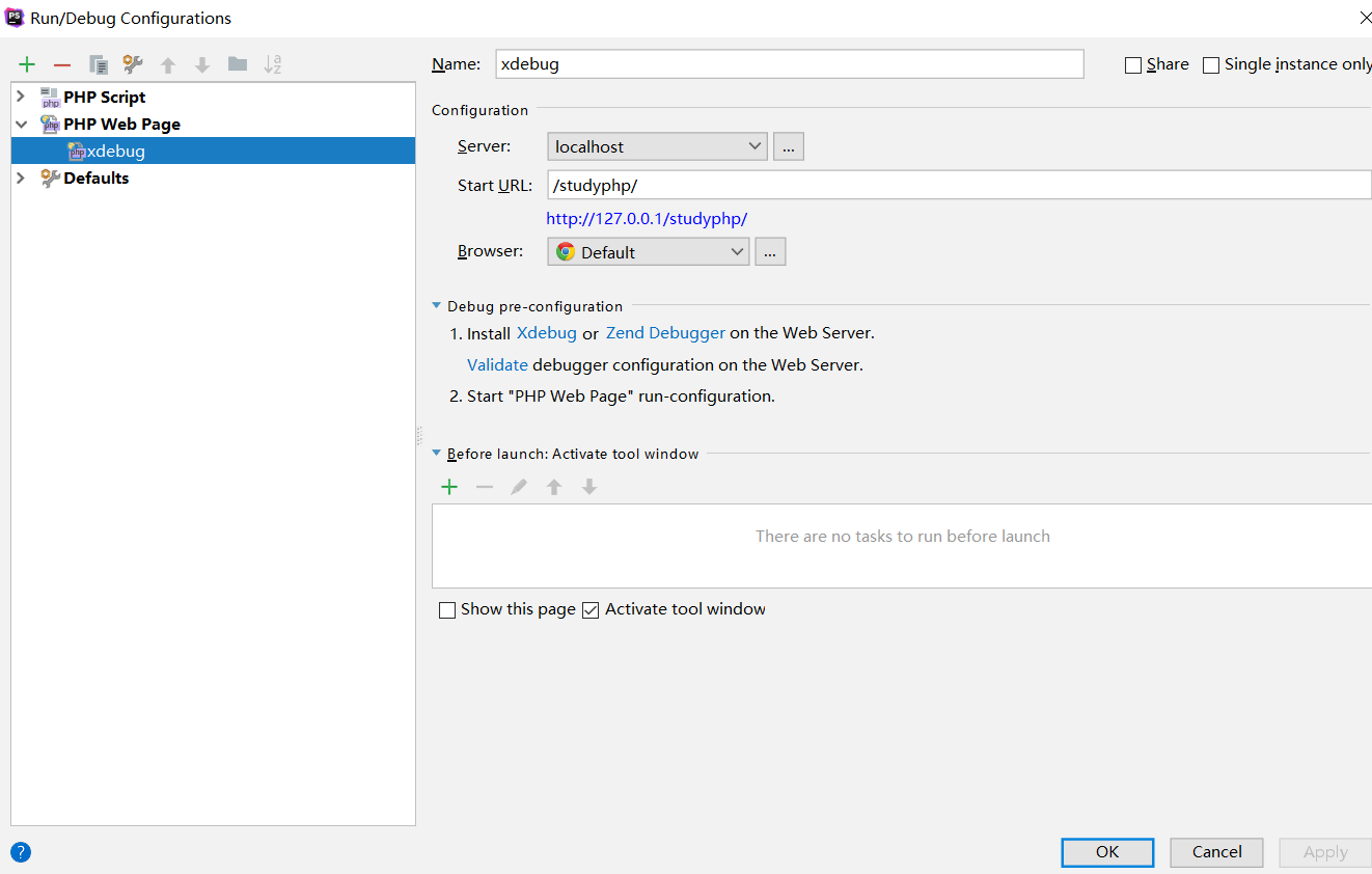 9、name随便取一个,Server就是之前phpstorm设置里的server,Start URL是网站的目录
