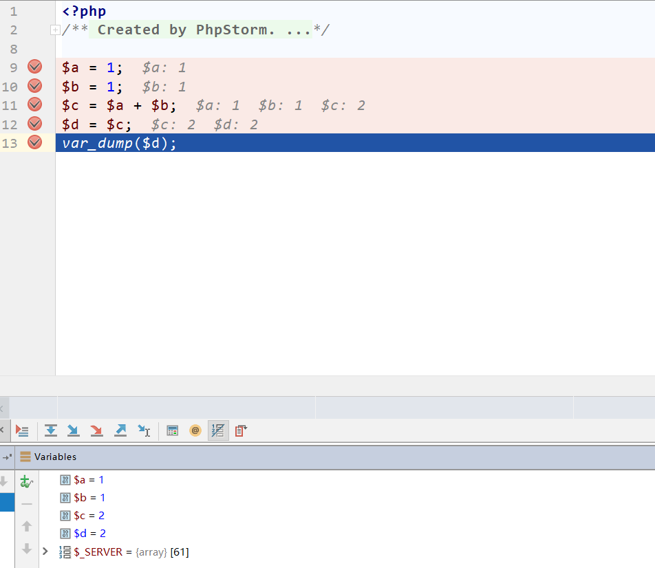 13、代码加上断点,开启右上角的debug模式(绿色虫子和一个座机电话图标),开启后本地运行或者浏览器访问文件开始debug