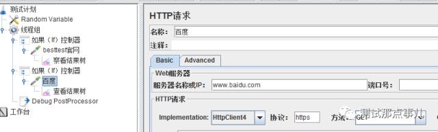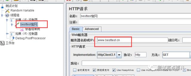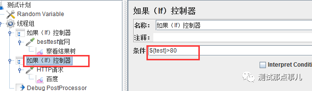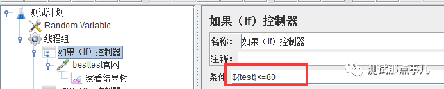 添加控制条件,控制执行请求,添加线程组,添加两个如果(if)控制器,然后在两个控制器下,分别添加2个http请求(访问besttest官网的),当随机数取值在20和100之间,则访问besttest官网;