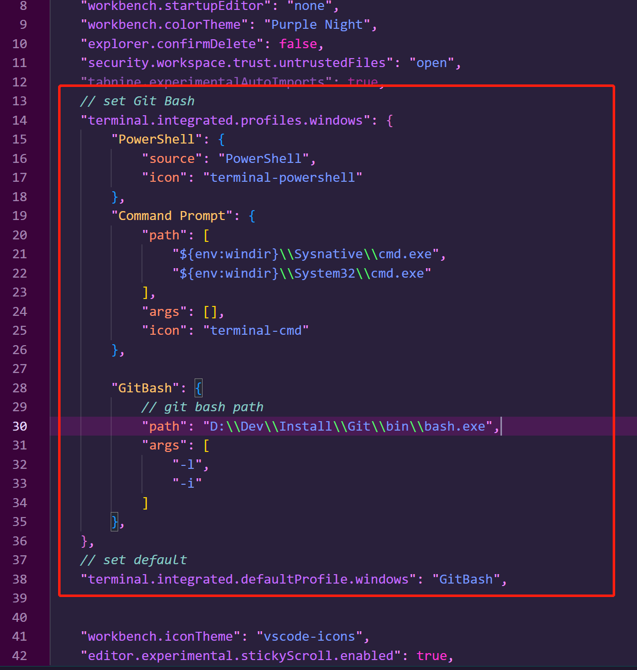 // set Git Bash "terminal.integrated.profiles.windows": { "PowerShell": { "source": "PowerShell", "icon": "terminal-powershell" }, "Command Prompt": { "path": [ "${env:windir}\\Sysnative\\cmd.exe", "${env:windir}\\System32\\cmd.exe" ], "args": [], "icon": "terminal-cmd" }, "GitBash": { // git bash path "path": "D:\\Dev\\Install\\Git\\bin\\bash.exe", "args": [ "-l", "-i" ] }, }, // set default "terminal.integrated.defaultProfile.windows": "GitBash",