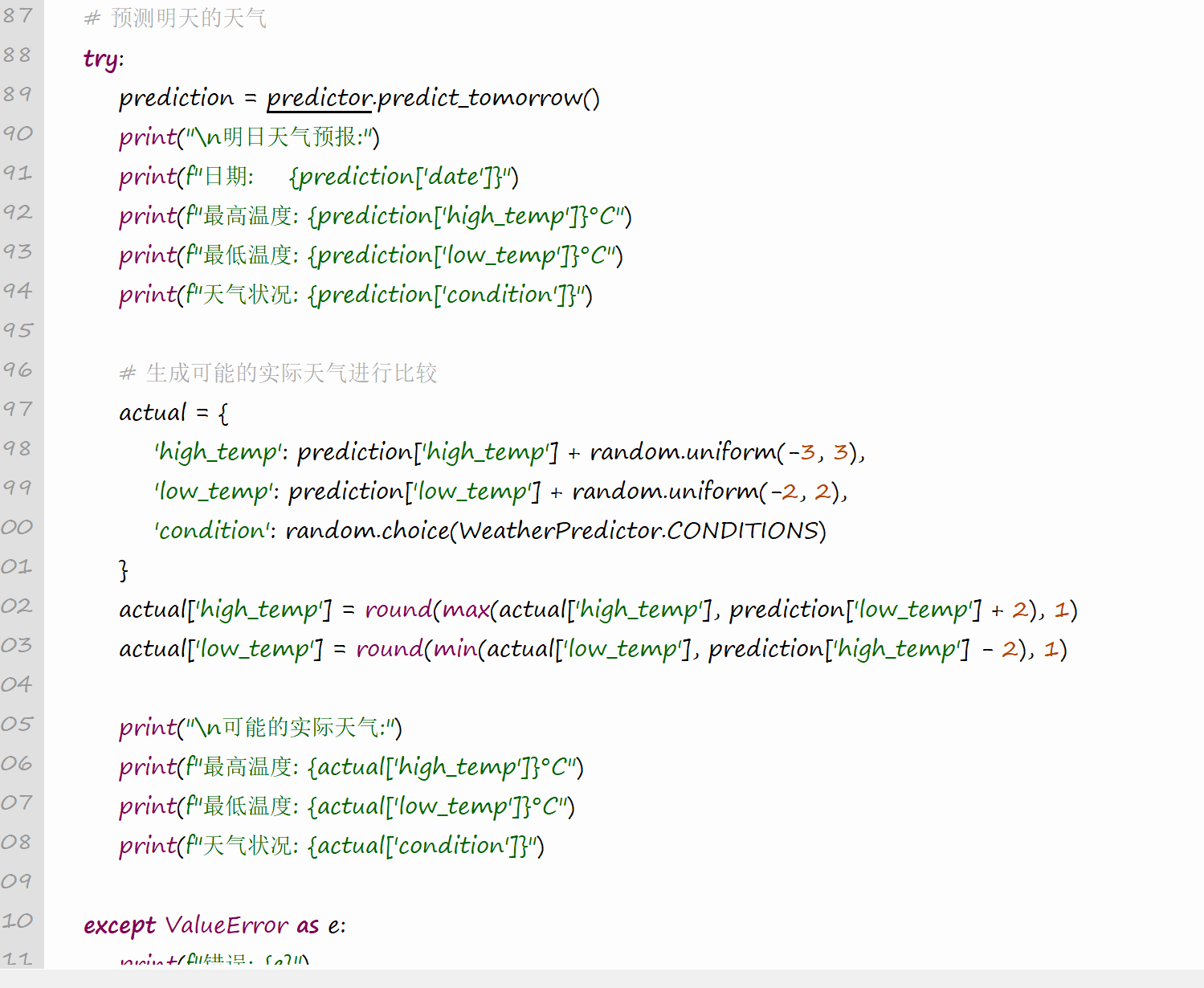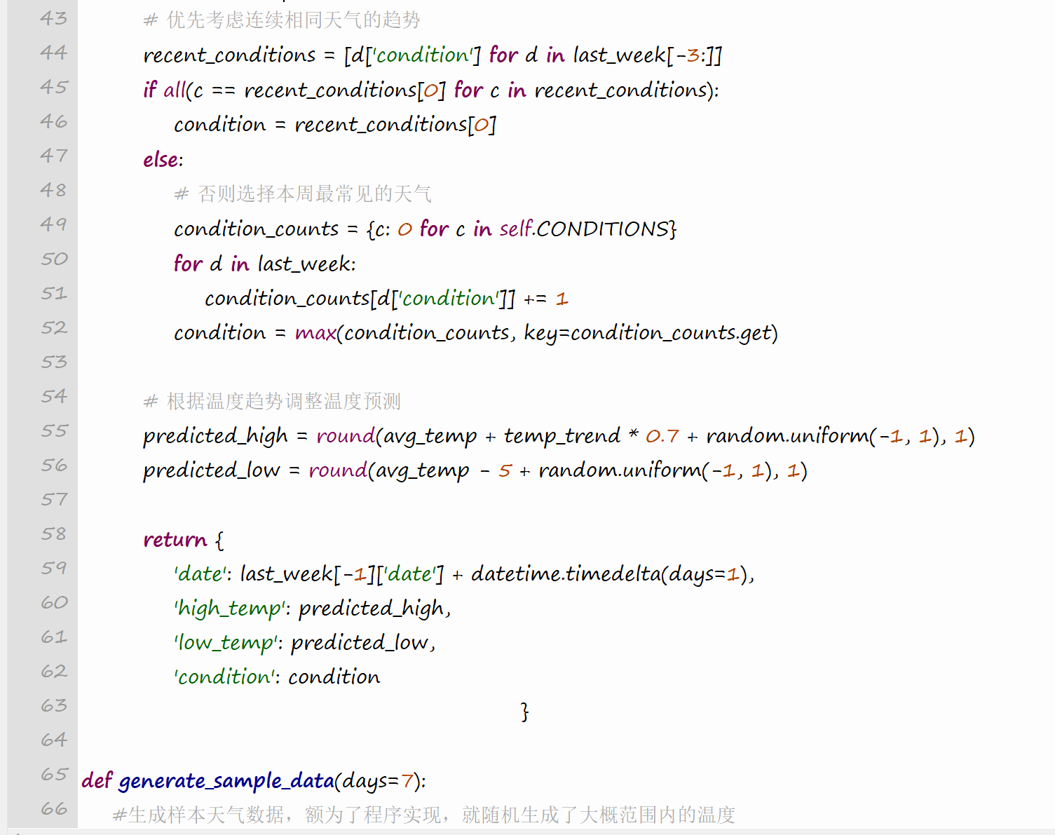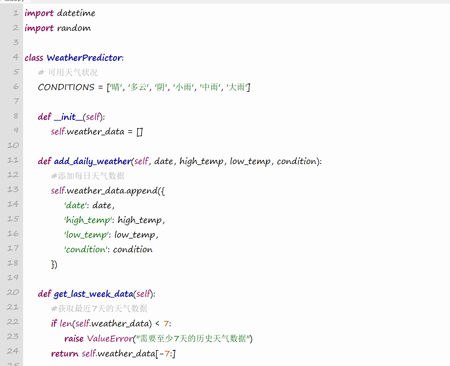 'condition': random.choice(WeatherPredictor.CONDITIONS)