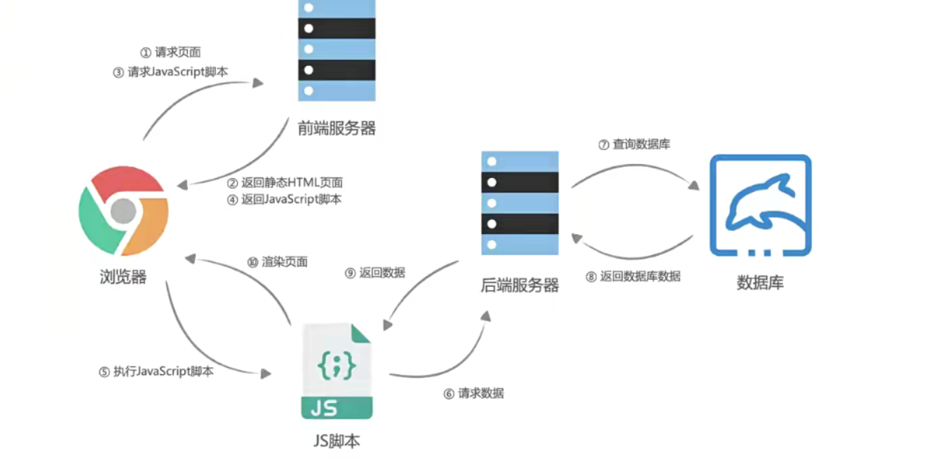 - 客户端发出请求->服务端接收请求并返回相应HTML文档—>页面刷新,客户端加载新的HTML文档;