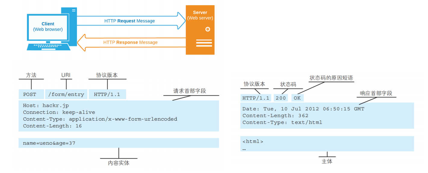 - 通过使用网页浏览器、网络爬虫或者其它的工具,客户端发起一个HTTP请求到服务器上指定端口(默认端口为80);