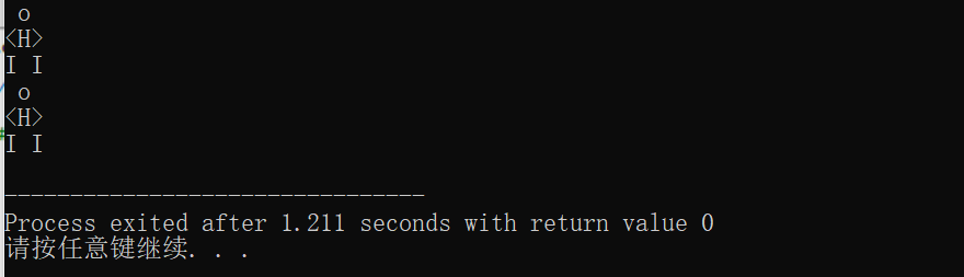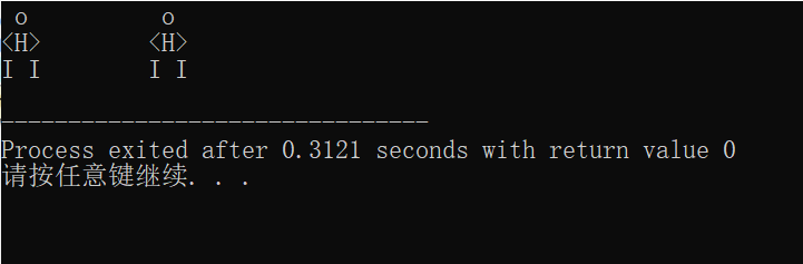 // 打印一个字符小人 #include <stdio.h> int main() { printf(" o \n"); printf("<H>\n"); printf("I I\n"); printf(" o \n"); printf("<H>\n"); printf("I I\n"); return 0; }