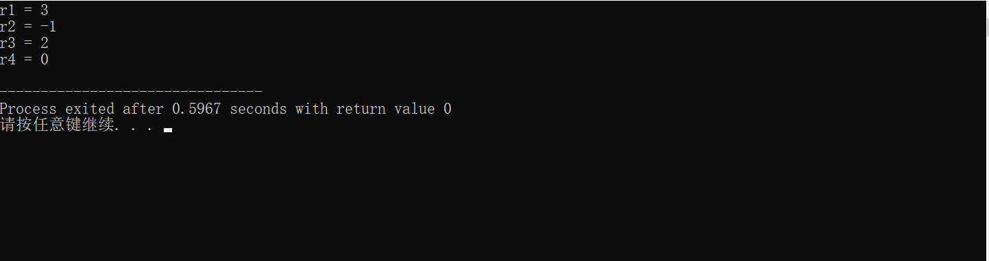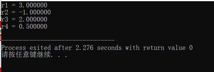 /* 用c语言实现的一个简单算术运算程序 */ #include <stdio.h> int main() { float x, y; // 定义两个整型变量,用来保存运算数据 float r1, r2, r3, r4; // 定义四个整型变量,用来保存加减乘除运算结果 x = 1; y = 2; r1 = x + y; r2 = x - y; r3 = x * y; r4 = x / y; printf("r1 = %f\n", r1); // 在屏幕上输出r1中存放的结果 printf("r2 = %f\n", r2); // 在屏幕上输出r2中存放的结果 printf("r3 = %f\n", r3); // 在屏幕上输出r3中存放的结果 printf("r4 = %f\n", r4); // 在屏幕上输出r4中存放的结果 return 0; }
