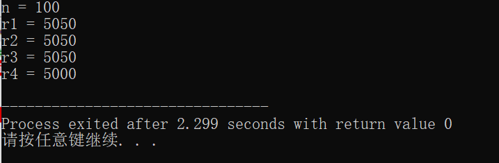 #include <stdio.h> int main() { int n, r1, r2, r3, r4; n = 100; r1 = n*(n+1)/2; r2 = (n+1)*n/2; r3 = n/2*(n+1); r4 = (n+1)/2*n; printf("n = %d\n", n); printf("r1 = %d\n", r1); printf("r2 = %d\n", r2); printf("r3 = %d\n", r3); printf("r4 = %d\n", r4); return 0; }
