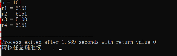 #include <stdio.h> int main() { int n, r1, r2, r3, r4; n = 101; r1 = n*(n+1)/2; r2 = (n+1)*n/2; r3 = n/2*(n+1); r4 = (n+1)/2*n; printf("n = %d\n", n); printf("r1 = %d\n", r1); printf("r2 = %d\n", r2); printf("r3 = %d\n", r3); printf("r4 = %d\n", r4); return 0; }