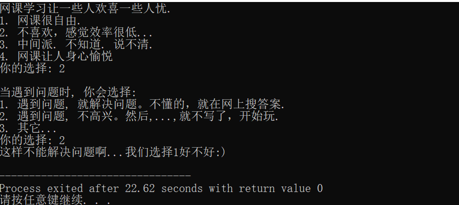 // 测试你是哪一类学习者 #include <stdio.h> int main() { int answer; char words[5000]; printf("网课学习让一些人欢喜一些人忧.\n"); printf("1. 网课很自由.\n"); printf("2. 不喜欢,感觉效率很低...\n"); printf("3. 中间派. 不知道. 说不清.\n"); printf("4. 网课让人身心愉悦\n"); printf("你的选择: "); scanf("%d", &answer); if(answer == 4) { printf("请补充说明你的想法: \n"); getchar(); // 这行代码为什么放在这里,大家暂时不用管 gets(words); // 喜欢上网课 , } printf("\n"); // 换行 printf("当遇到问题时, 你会选择:\n"); printf("1. 遇到问题, 就解决问题。不懂的,就在网上搜答案.\n"); printf("2. 遇到问题, 不高兴。然后,...,就不写了,开始玩.\n"); printf("3. 其它...\n"); printf("你的选择: "); scanf("%d", &answer); if(answer == 1) printf(":)\n"); else if(answer == 2) printf("这样不能解决问题啊...我们选择1好不好:)\n"); else if(answer == 3) { printf("请补充说明你的想法: \n"); getchar(); // gets(words); // } return 0; }