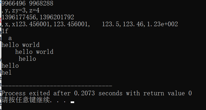 // 格式化输入输出函数,及各种格式控制符的使用 #include <stdio.h> int main() { int x=1234; float f=123.456; double m=123.456; char ch='a'; char a[]="hello world";//定义一个字符型数组a,数组中存在字符串常量hello world! int y=3,z=4; printf("%d %d\n,y,z") ; printf("y=%d,z=%d\n",y,z); printf("%8d,%2d\n,x,x"); printf("%f,%8f,%8.1f,%0.2f,%.2e\n",f,f,f,f,f); printf("1f\n",m); printf("%3c\n",ch); printf("%s\n%15s\n%10.5s\n%2.5s\n%.3s\n",a,a,a,a,a); return 0