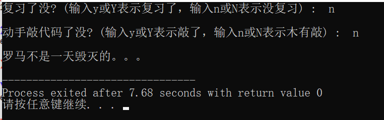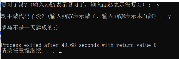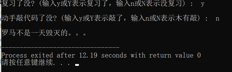 #include <stdio.h> int main() { char ans1, ans2; printf("复习了没? (输入y或Y表示复习了,输入n或N表示没复习) : "); ans1 = getchar(); getchar(); printf("\n动手敲代码了没? (输入y或Y表示敲了,输入n或N表示木有敲) : "); ans2 = getchar(); if(ans1=='y'&&ans2=='y'||ans1=='y'&&ans2=='Y'||ans1=='Y'&&ans2=='y'||ans1=='Y'&&ans2=='Y') printf("\n罗马不是一天建成的:)\n"); else printf("\n罗马不是一天毁灭的。。。\n"); return 0; }
