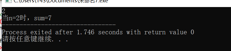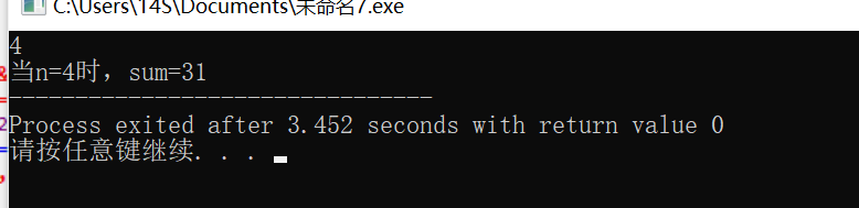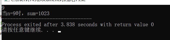#include <stdio.h> #include<math.h> int main(){ int n,sum; scanf("%d",&n); if(n>=1&&n<=9){ sum=(1-pow(2,n+1))/(1-2); printf("当n="); printf("%d",n); printf("时,sum="); printf("%d",sum); } else printf("你的输入不合法."); return 0; }