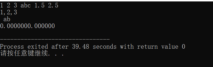 #include <stdio.h> int main() { double x,y; char c1,c2,c3; int a1,a2,a3; scanf("%d%d%d",&a1,&a2,&a3); printf("%d,%d,%d\n",a1,a2,a3); scanf("%c%c%c",&c1,&c2,&c3); printf("%c%c%c\n",c1,c2,c3); scanf("%lf,%lf",&x,&y); printf("%f%lf\n",x,y); return 0; }