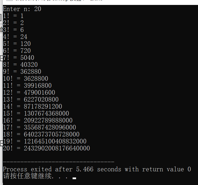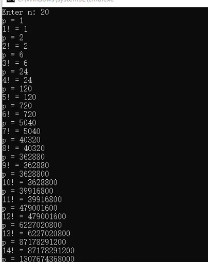 printf("%d! = %lld\n", i, fac(i));