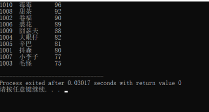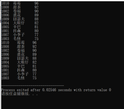 printf("%-6d%-10s%3d\n",st[i].num,st[i].name,st[i].score);