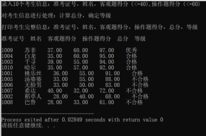 printf("\n打印考生完整信息:准考证号,姓名,客观题得分,操作题得分,总分,等级\n");
