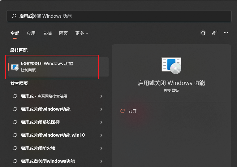 打开Windows的搜索框,搜索并打开 启用或关闭Windows功能