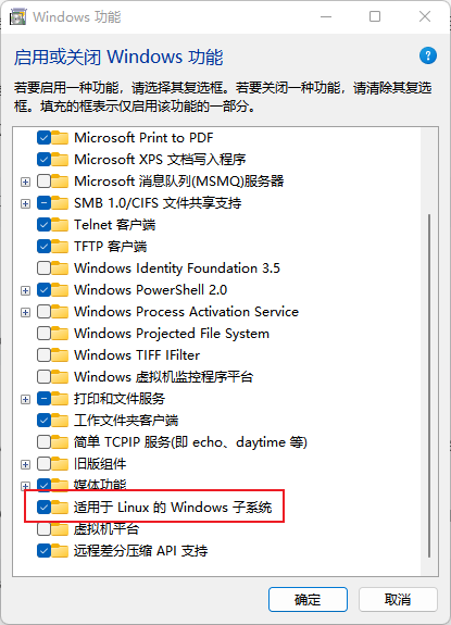 把 适用于Linux的Windows子系统 前面的复选框勾上,然后点击确定,然后重启电脑