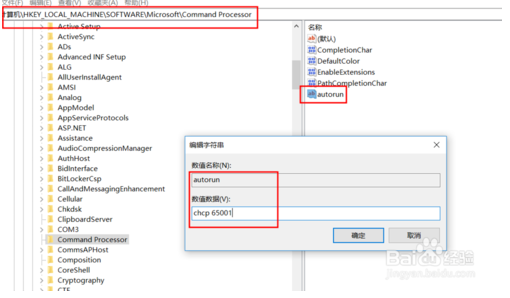 新建autorun字符串值,设置完名称后右击打开窗口后输入数值数据chcp 65001,然后点击保存