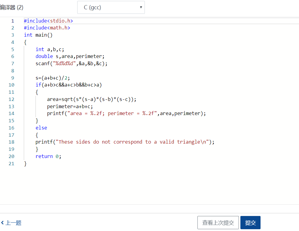 刚写完时一直是部分正确,能构成三角形的情况一直错误的,后来重新打了一遍,把公式放进if{}内,还修改了scanf才正确。