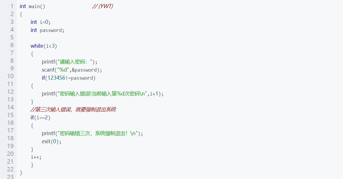 该代码是使用循环实现三次密码输入错误退出系统。在中间,我可以学到循环语法while,以及定义一个i=0,还有exit()语法。